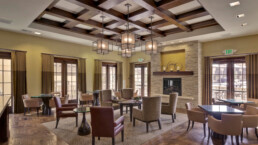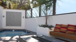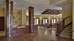 Upgrades to the hotel’s outdoor amenities were also part of the design. Decorative metal gates, wood wall panels, and enhanced lighting make the pool area more visible and inviting. A new firepit, decorative tile finishes, and cozy seating help create a warm, relaxing atmosphere for guests.