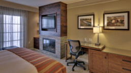 The exterior and interior renovations of the existing guest rooms were modernized to align with the Mission-style architecture and Craftsman detailing of the new building. A total of 93 updated guest rooms now feature either a king bed or two queen beds, many with fireplaces. In addition to the room upgrades, WRD Architects also designed 645 square feet of flexible meeting space.